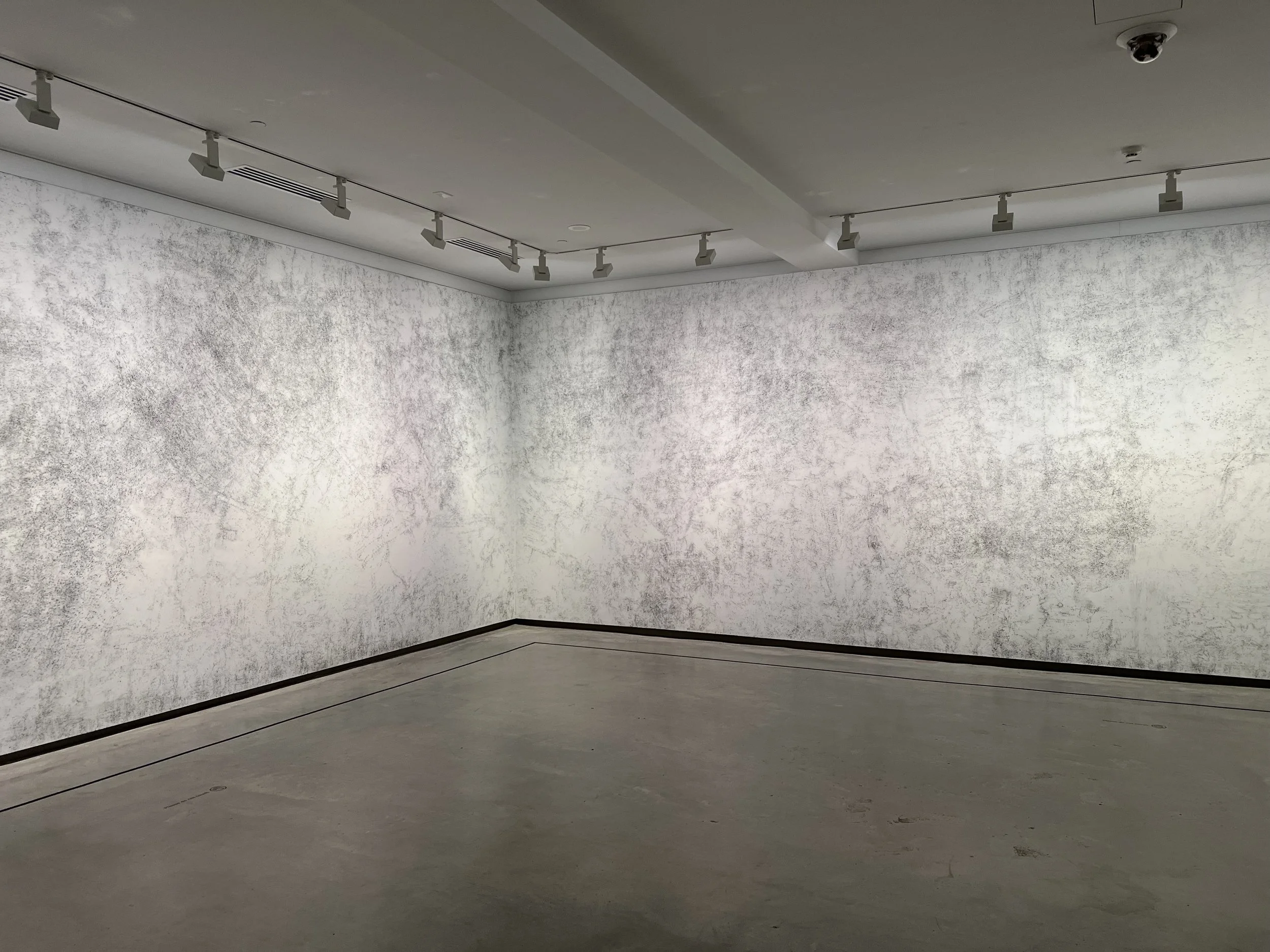 Nicholson’s process of making the wall drawing instead gradually dissolves the outlines of the ‘cartoons’ through a repeated pouncing. The wall drawing becomes a field that implies a range of associations, like a provisional map of the world or an inverted image of the night sky with black points on a white ground. Nicholson describes the result as ‘a kind of weather’: a space in which to grapple imaginatively with the complex histories that connect Warren and the MCA to other parts of the world, and which cannot be contained within the limits of a picture.