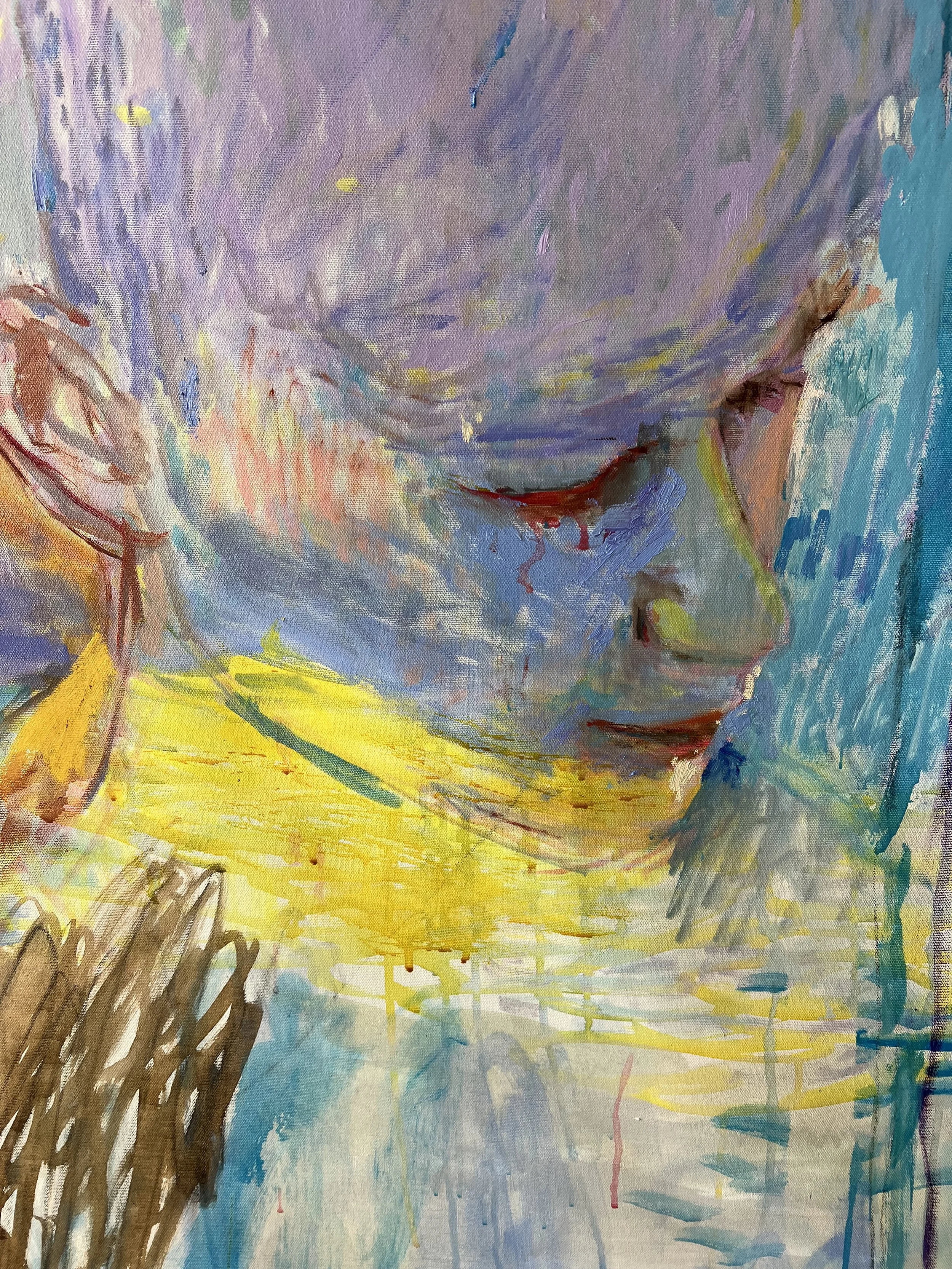 “Alice Neel painted from observation, and I use formal ideas taken from abstraction. It occurs to me that some people might think including mothers and children is nevertheless sentimental. I’m also struggling with how to represent gender and race and have deliberately made my figures multicoloured and somewhat androgynous.”