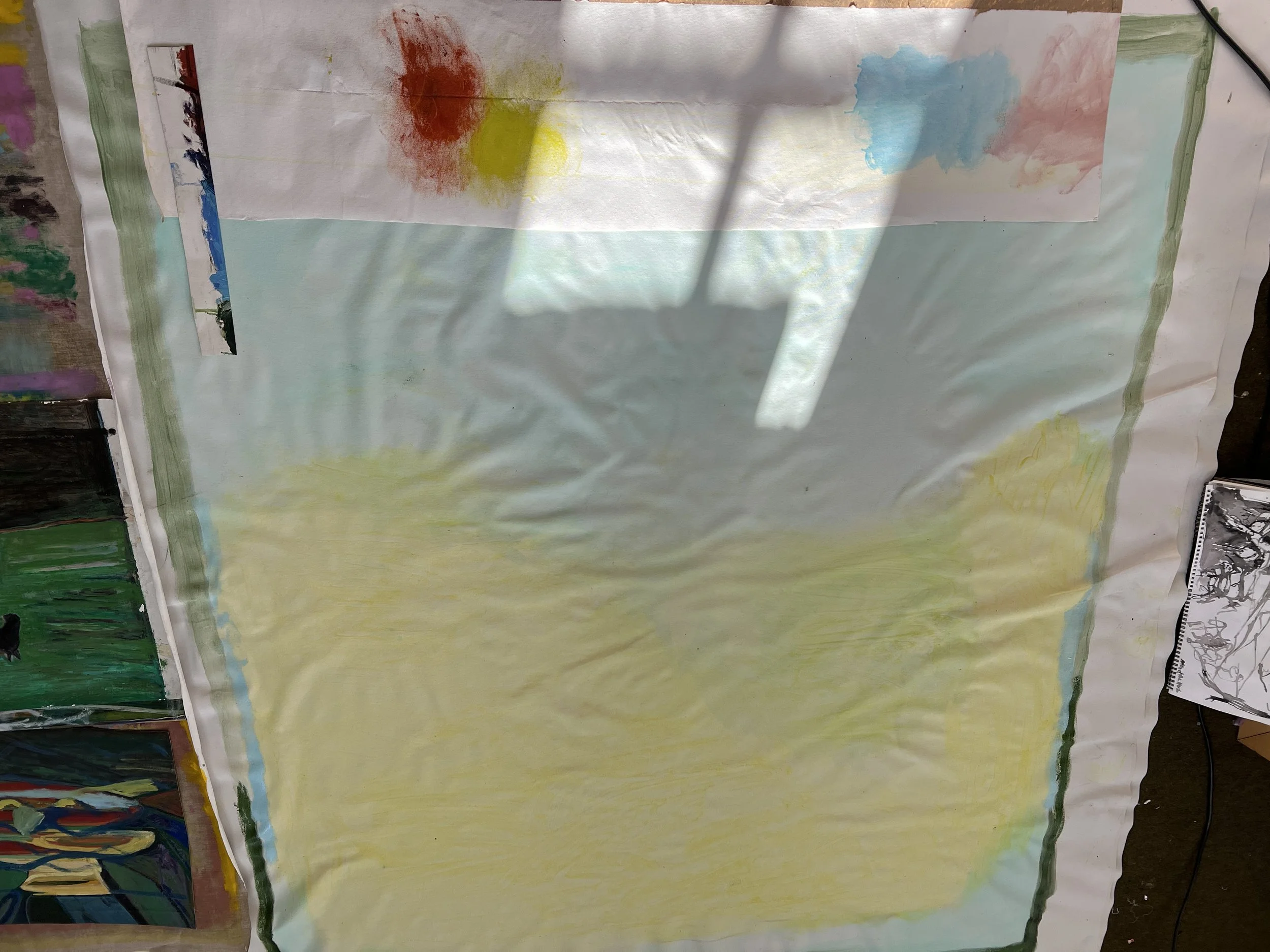 I use repetition of studio habits, mixing paint first, making tea, putting on the same music, total privacy to get into the state of flow. Colours therefore are pre-considered during this process as I must mix large quantities...