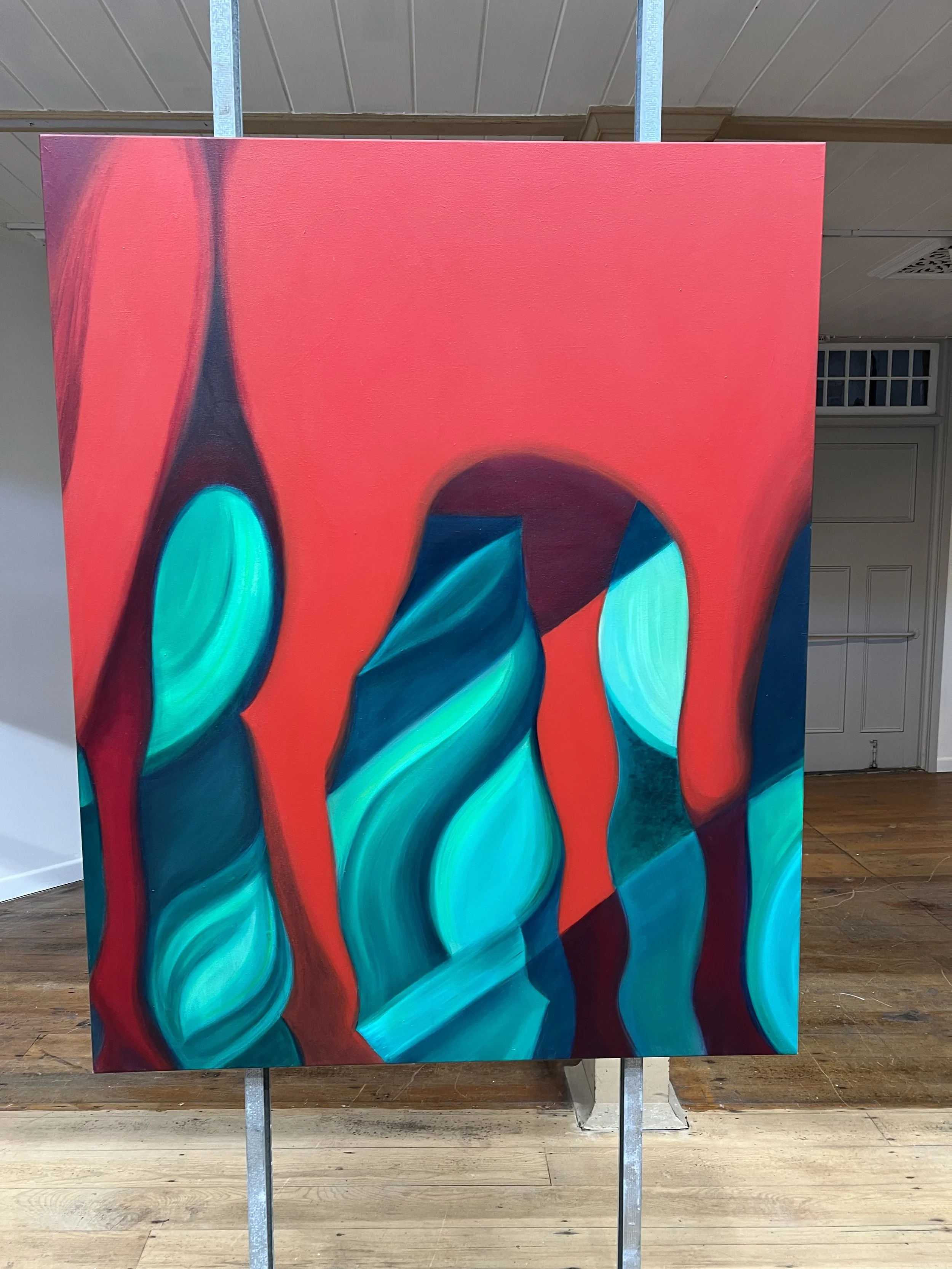 This unique repurposed exhibition space is in the old chapel adjacent to Micheal Letts main gallery. The lighting worked well as it was very subdued and directional on some of the glowing ‘quieter’ works in the side galleries and the main wall was filled with natural light. It was a great opportunity to see her works up close. I could study the acrylic layers, she uses, as well as the different supports, like hessian, calico and linen.